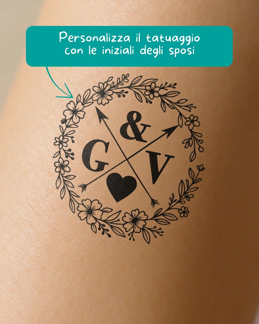 Il tatuaggio è personalizzabile con le iniziali degli sposi, inserite all’interno di una ghirlanda decorativa dal design sobrio e raffinato.