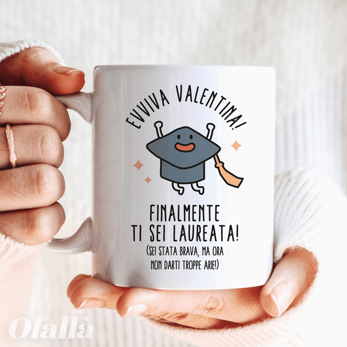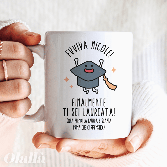 Simpatica Tazza Mug con scritta “Evviva, finalmente ti sei laureata! (ora prendi la laurea e scappa prima che ci ripensino)” oppure “Evviva, finalmente ti sei laureata! (sei stata brava, ma ora non darti troppe arie!) da regalare all’amica o amico che si laurea. Un pensiero divertente per prolungare i festeggiamenti ad ogni colazione!