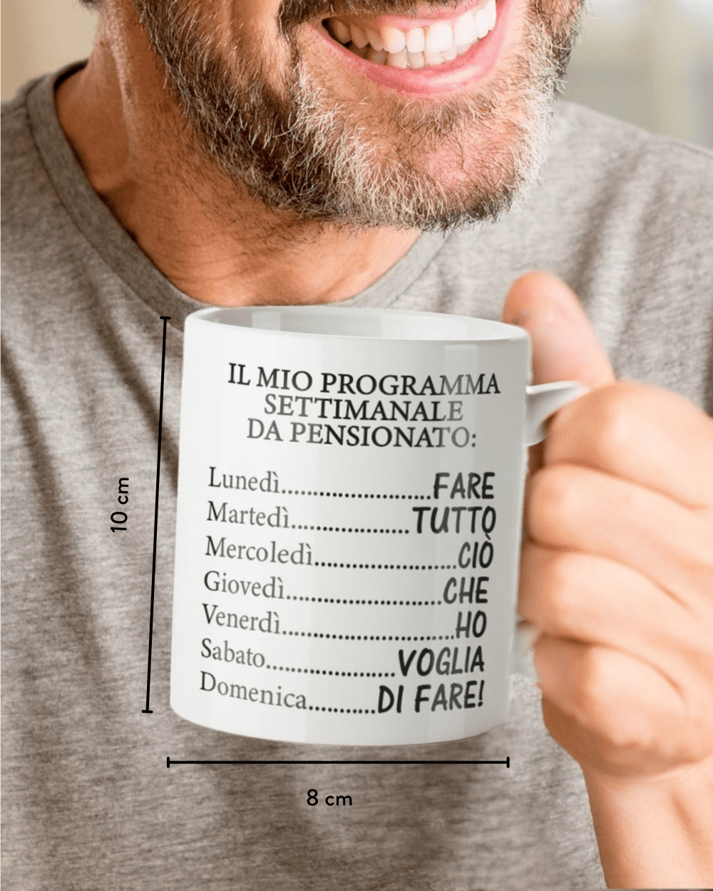 - Fantastica idea regalo per un neopensionato! Il pensionamento è un traguardo importante e merita di essere festeggiato con stile! Questa tazza, con il suo design spiritoso, è il modo ideale per celebrare questo nuovo capitolo della vita. Il messaggio “Il Mio Programma Settimanale Da Pensionato” aggiunge un tocco di umorismo e rende questo regalo indimenticabile.