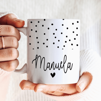 Carinissima Tazza Personalizzabile con il nome del tuo amore arricchito da tanti pois e un cuoricino. Pensata per addolcire il caffè della tua lei o del tuo lui ogni mattina a colazione, questa tazza mug è l’idea regalo perfetta per San Valentino o per il vostro anniversario, o semplicemente per celebrare il vostro amore, speciale ogni giorno.