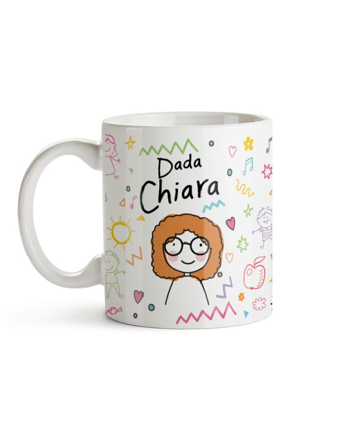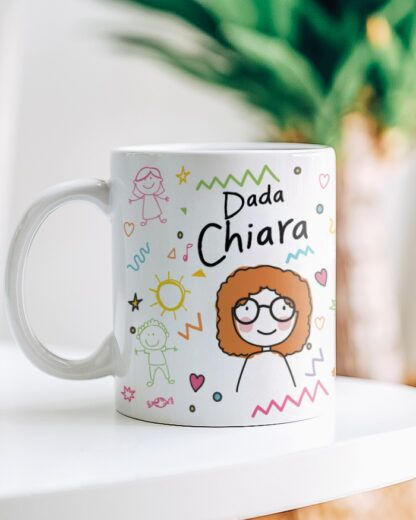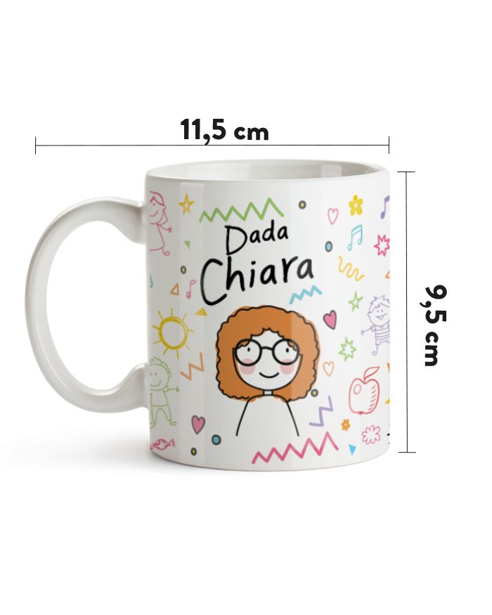 Meravigliosa tazza in ceramica personalizzabile con un omino stilizzato che riproduce le sembianze della vostra amata maestra d’asilo, Dada, completata con il suo nome e una dolce dedica sul retro.