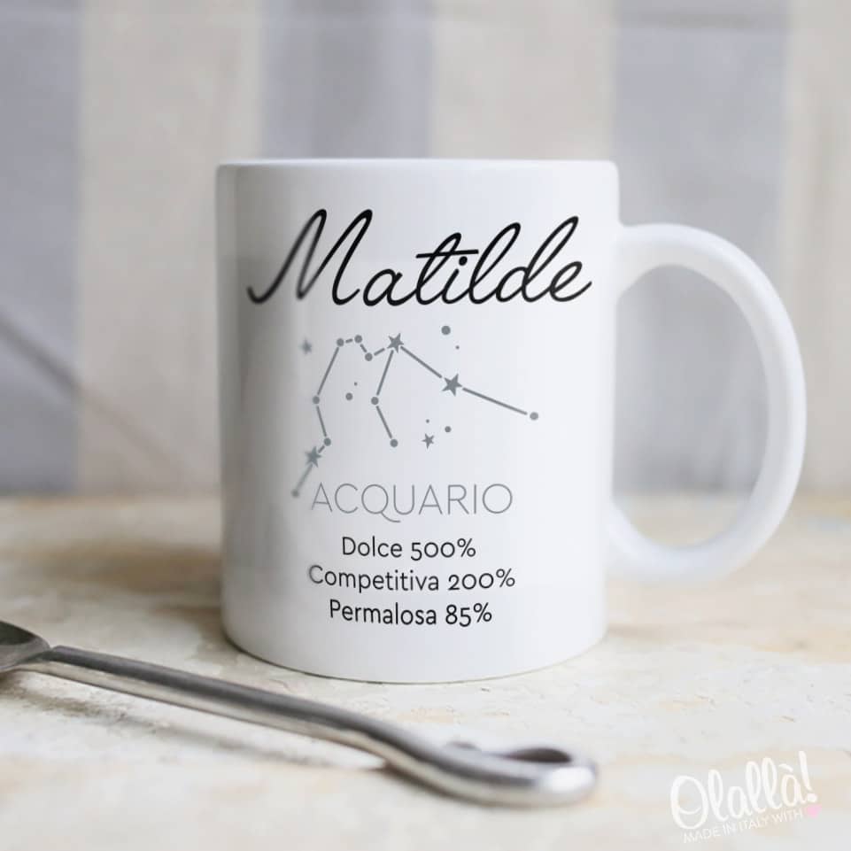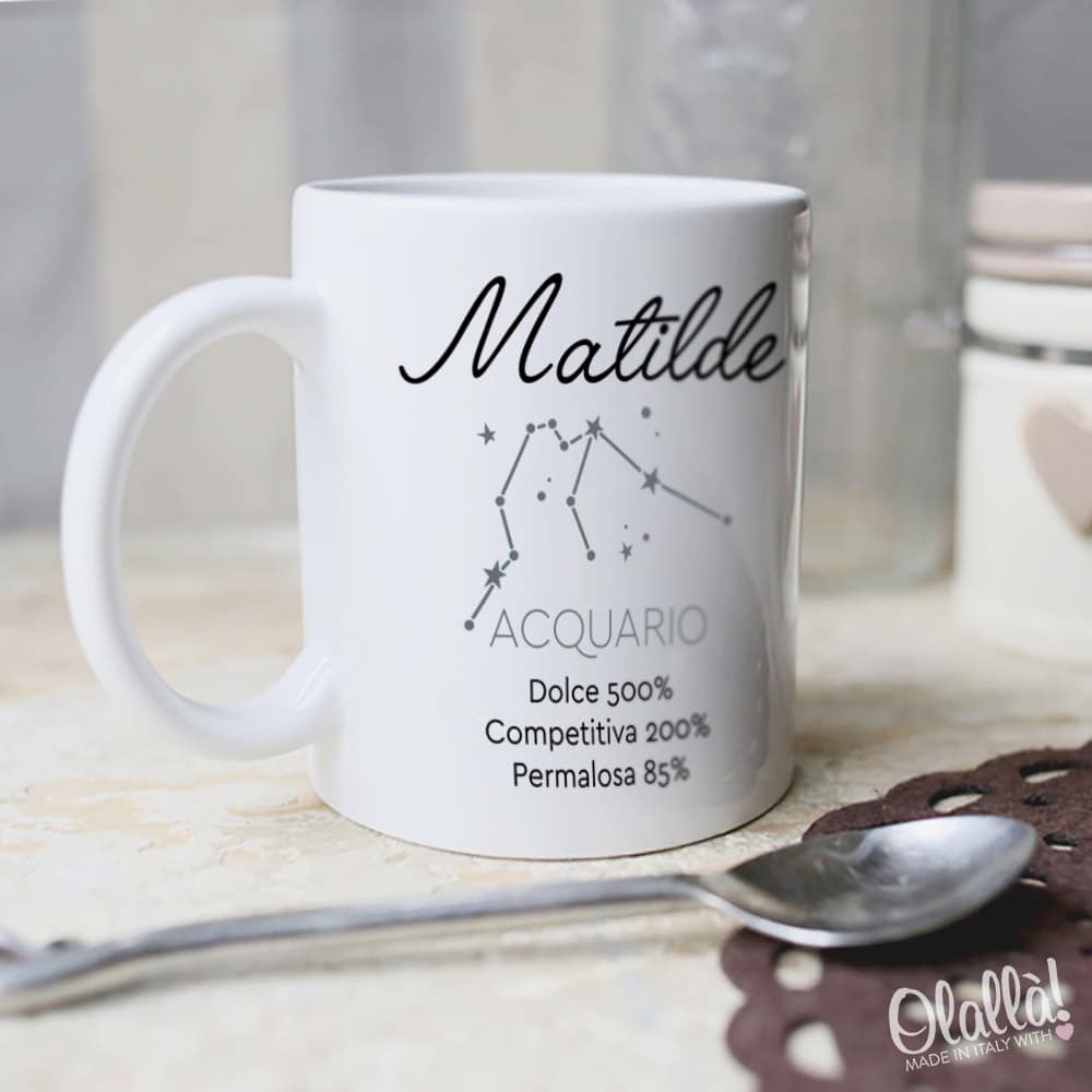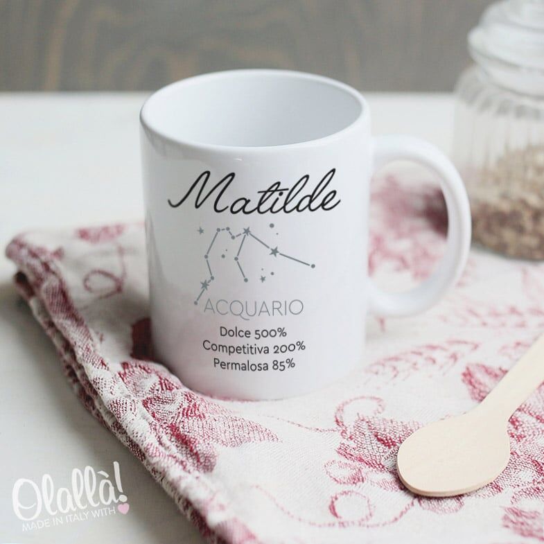 Splendida tazza in ceramica, personalizzata artigianalmente con la tecnica della termosublimazione, con il vostro nome, il vostro segno zodiacale e una breve dedica. Puoi personalizzare la tazza come più preferisci. L’elaborazione grafica è inclusa nel prezzo, e con l’aggiunta di solo 1€ puoi visionarla in anticipo. Puoi rendere la tazza ancora più speciale grazie alla possibilità di aggiungere una dedica sul retro.