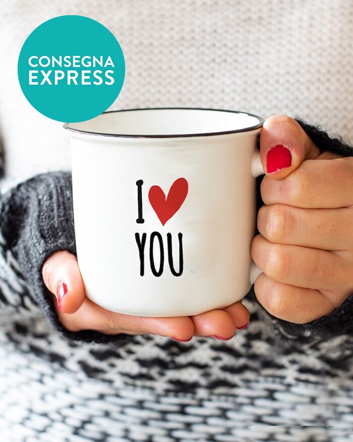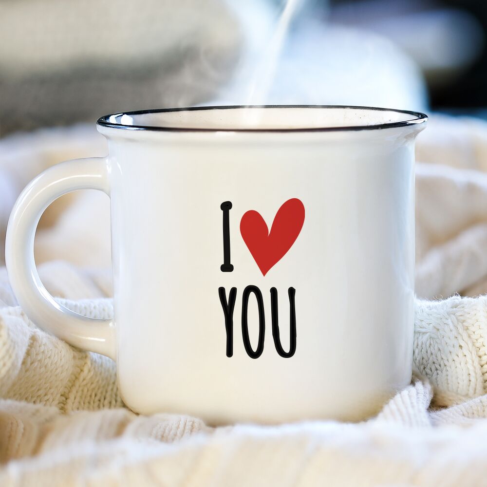 Meravigliosa Tazza Vintage con Bordo Nero, personalizzabile con la frase “I Love You” con cuoricino. Pensata per addolcire il caffè della tua lei o del tuo lui ogni mattina a colazione, questa tazza mug è l’idea regalo perfetta per San Valentino o per il vostro anniversario, o semplicemente per celebrare il vostro amore, speciale ogni giorno.