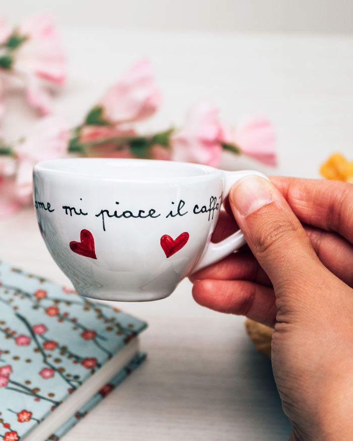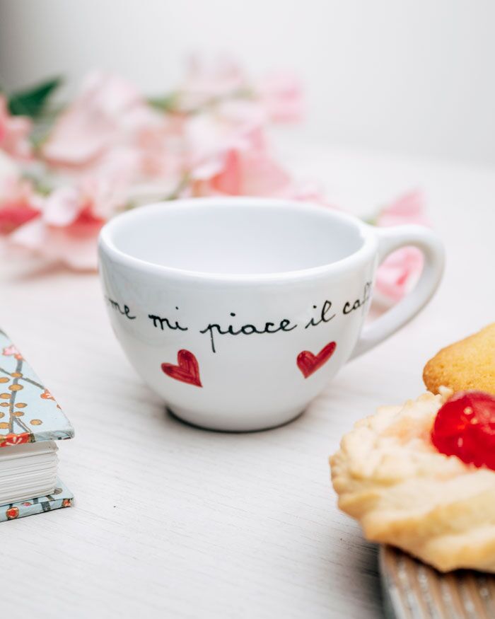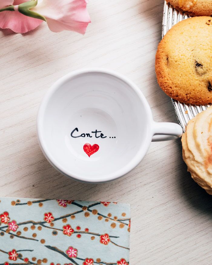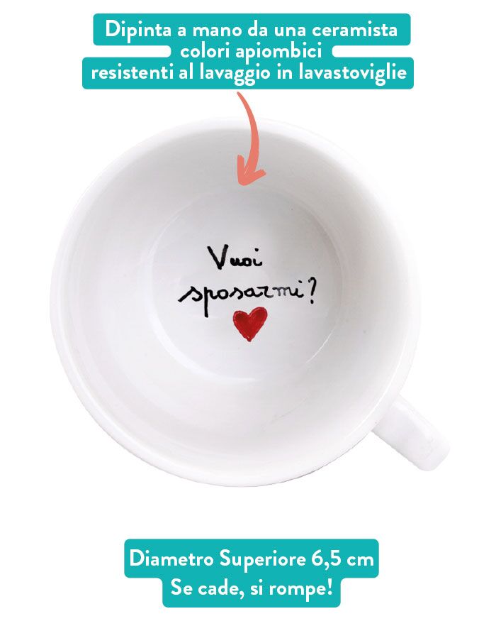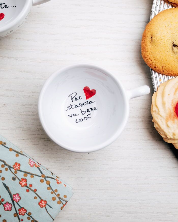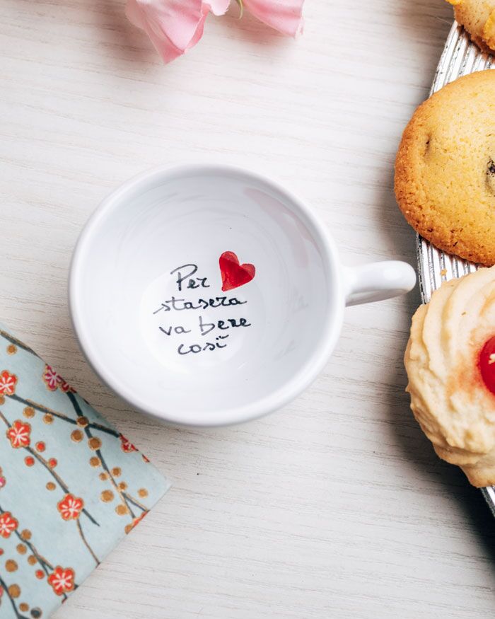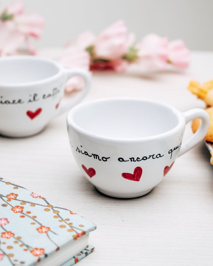 Tazzina in ceramica con messaggio segreto, dedica esterna e cuoricini. Un modo originale per ricordare alla tua dolce metà, marito o moglie che sia, che sei sempre vicino a lui, nelle giornate buone e in quelle meno buone, ma che iniziano tutte, immancabilmente, con un bel caffè.