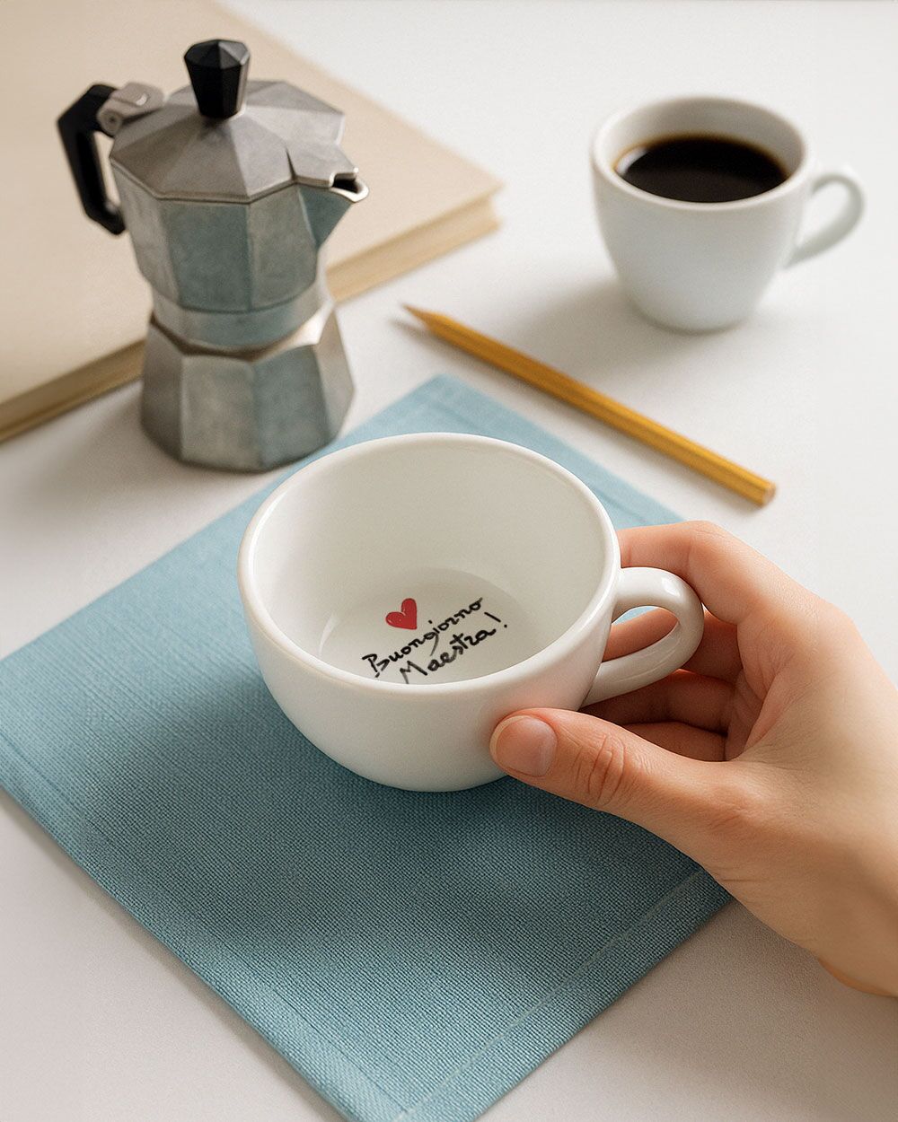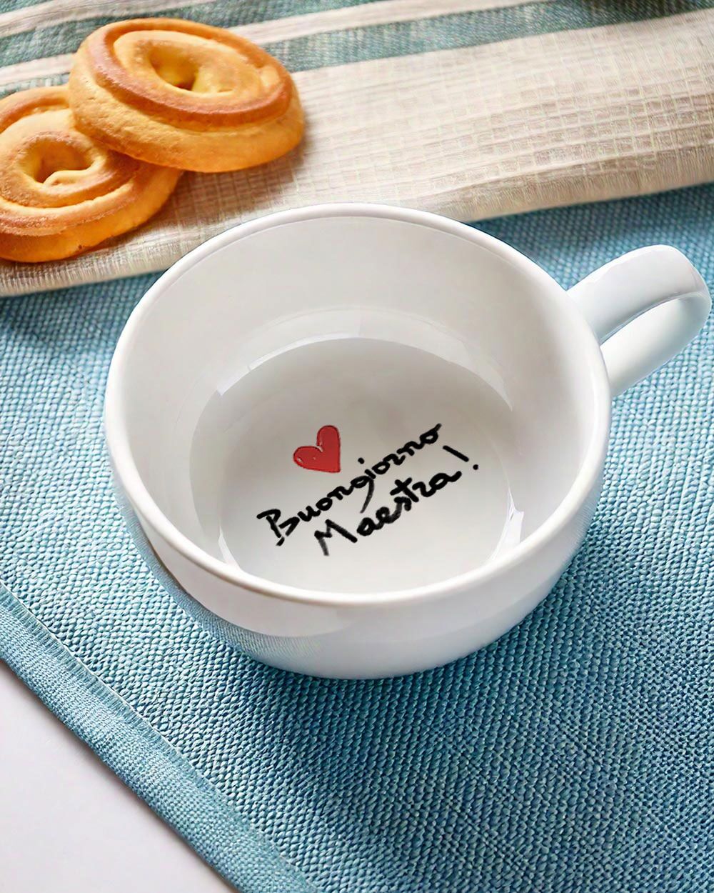 Puoi scegliere una delle nostre frasi predefinite pensate appositamente per le maestre – come “Maestra migliore del mondo” o “Buongiorno Maestra!” – oppure, con un piccolo costo aggiuntivo e qualche giorno in più per la consegna, potrai scrivere tu stesso il messaggio segreto. Il risultato sarà una tazzina personalizzabile unica nel suo genere, che farà emozionare ogni volta che verrà usata. Un regalo che non verrà dimenticato!