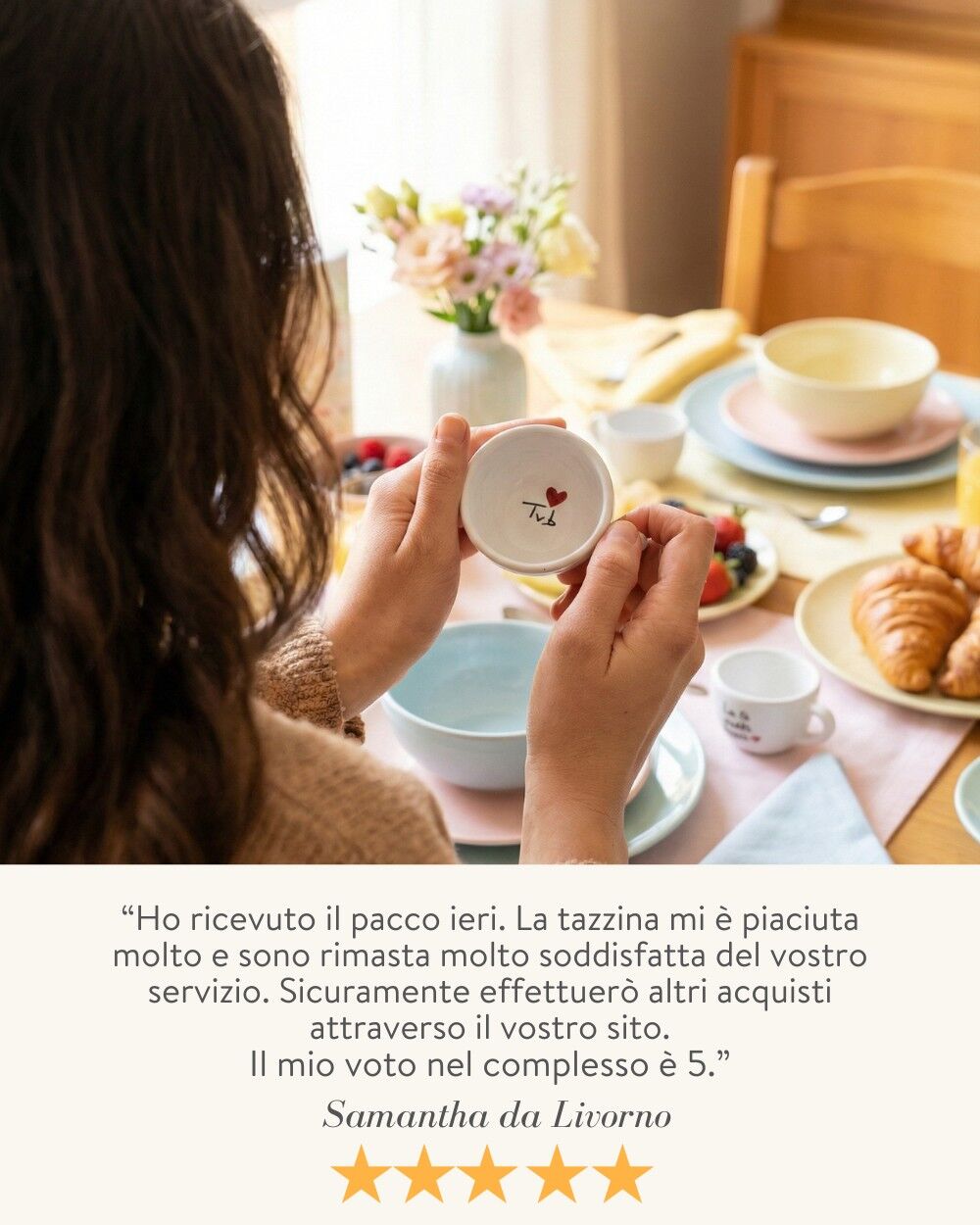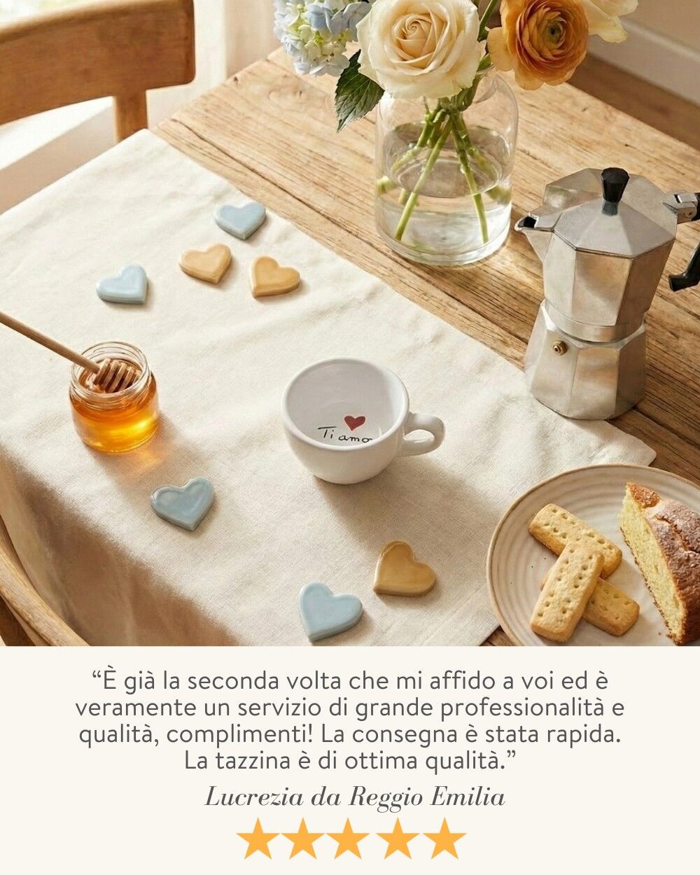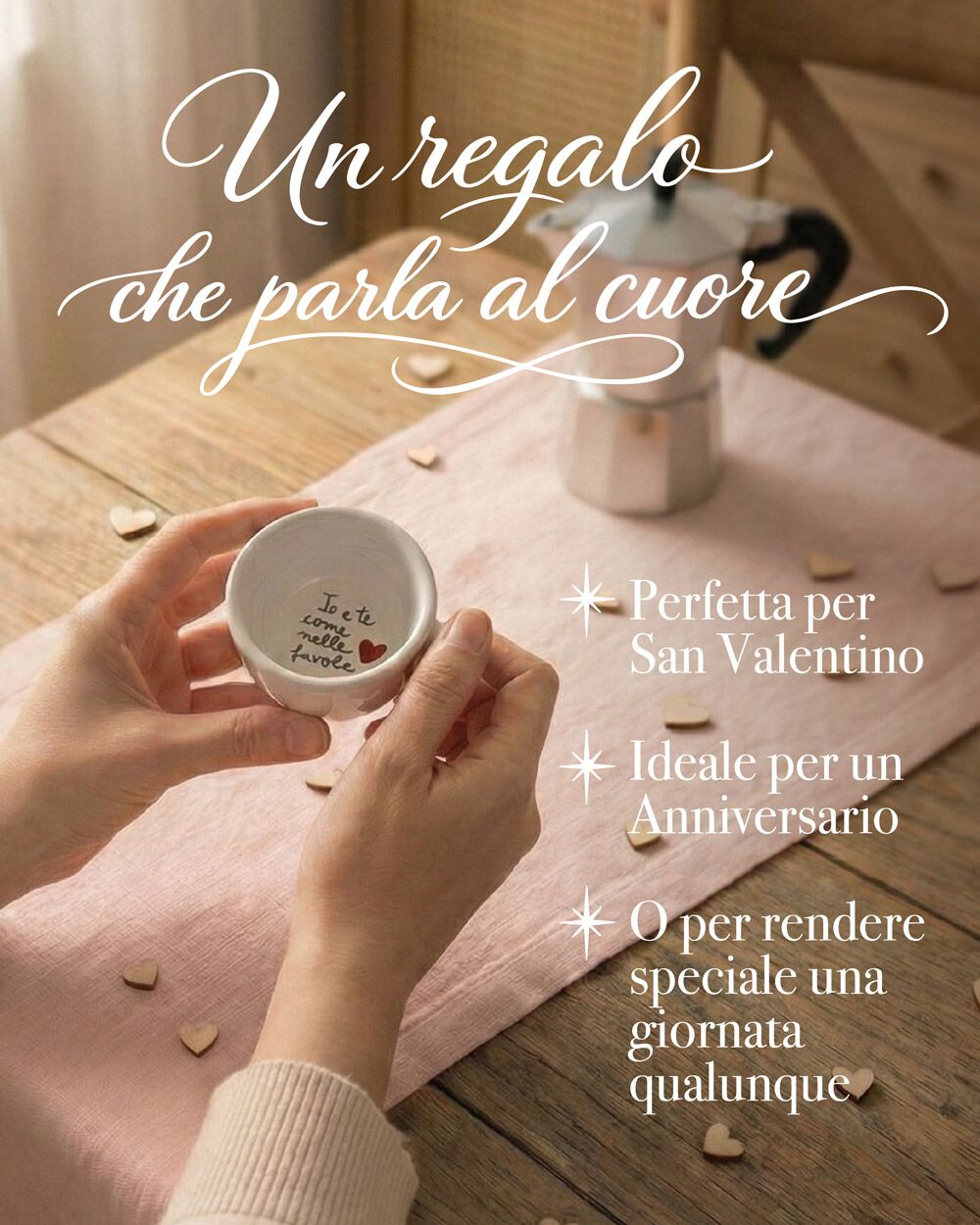 È una tazzina che si vive, non si mette su una mensola a prendere polvere. Ogni mattina diventa un “ti amo” silenzioso che accompagna il risveglio.