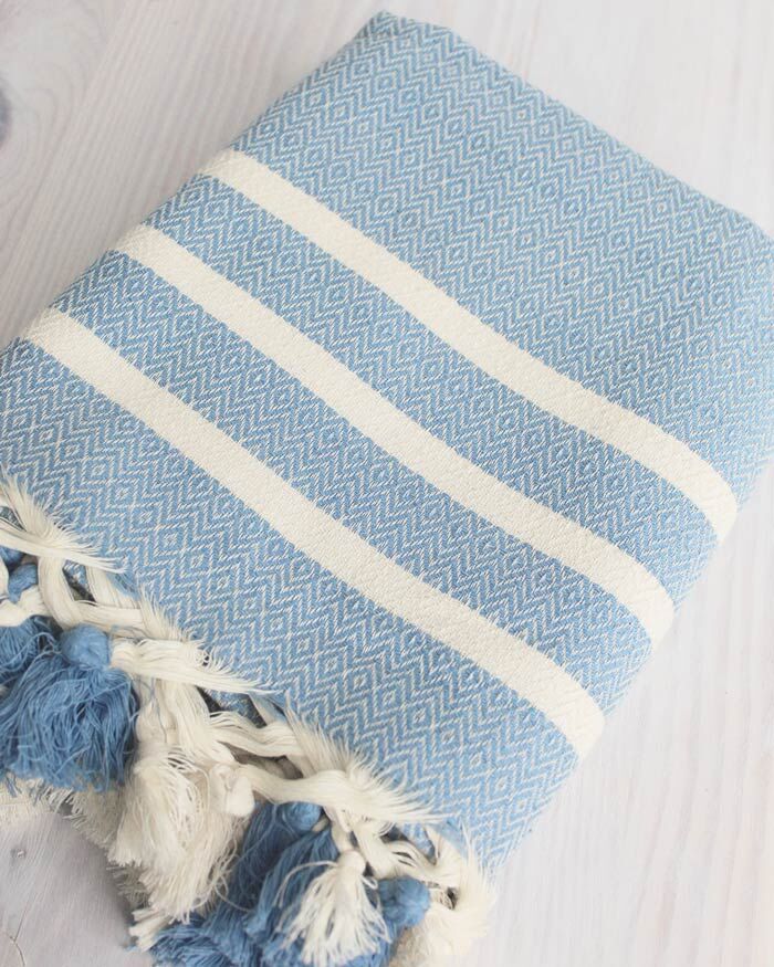Telo mare fouta color azzurro con pompon 100 % cotone personalizzato con stampa o ricamo del Nome: rilassati a bordo piscina o sulla spiaggia!