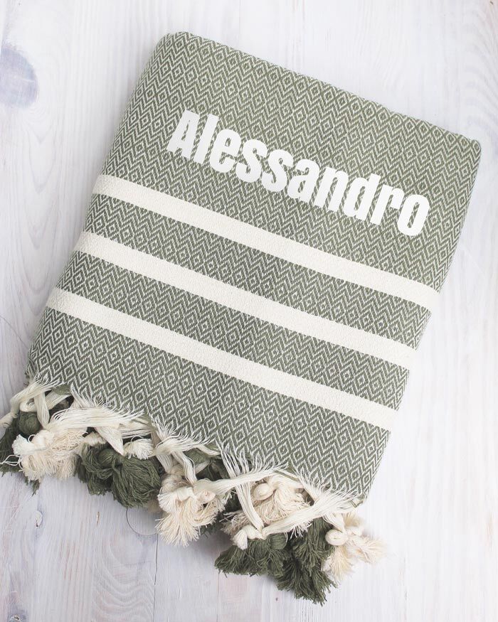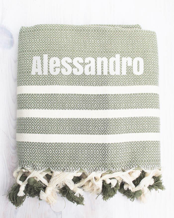 Telo mare fouta color kaki con pon pon 100% cotone personalizzato con stampa o ricamo del nome – l’Idea regalo estate che stavi cercando