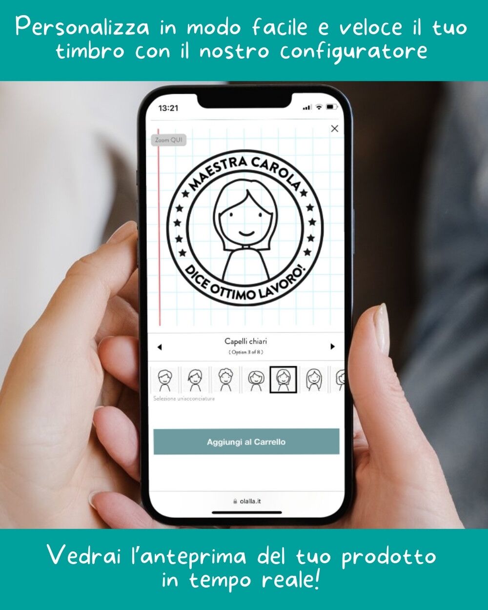 La cosa che rende questo timbro davvero unico è il ritratto stilizzato personalizzabile: non un’illustrazione generica, ma una versione illustrata della maestra (o del maestro) creata scegliendo le caratteristiche che la avvicinano di più a lei. Capelli corti o lunghi, lisci o mossi, chiari o scuri, occhiali sì o no, barba per i maestri uomini — ogni dettaglio è selezionabile direttamente dal configuratore.