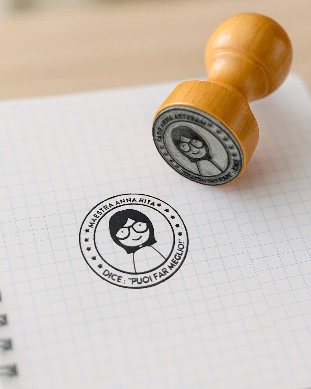 Questo timbro personalizzato per la maestra è esattamente questo: un oggetto utile, originale e fatto su misura per lei. Con un ritratto stilizzato che le somiglia, il suo nome e la sua frase preferita da mettere sui compiti dei bambini, diventa uno strumento che usa ogni giorno — e ogni volta ricorda quella classe, quei bambini, quei genitori che hanno pensato a lei con affetto.