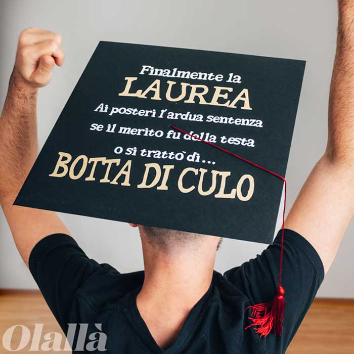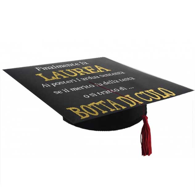 Tocco originale per festeggiamenti di laurea davvero speciali! Sul tradizionale copricapo che si indossa alla laurea è stampata la frase “Finalmente la laurea ai posteri l’ardua sentenza se il merito fu della testa o si trattò di botta di culo”. Ideale per celebrare tra le risate l’agognato traguardo del neo dottore!
