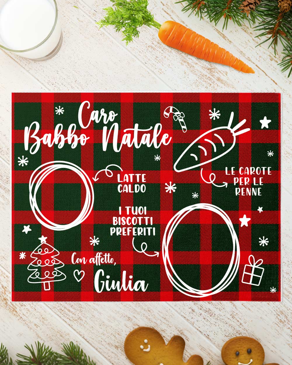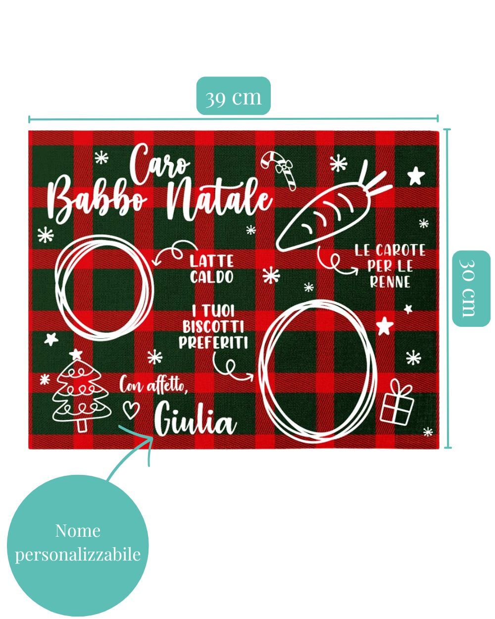 Il Natale è un momento di pura magia, soprattutto per i bambini che attendono con trepidazione l’arrivo di Babbo Natale. Con la nostra Tovaglietta Natalizia in Tartan per l’Arrivo di Babbo Natale, Personalizzata con Nome, ogni piccolo gesto diventa un ricordo indimenticabile. Perfetta per disporre latte, biscotti e carote per le renne, questa tovaglietta aggiunge un tocco di magia e tradizione alla serata più speciale dell’anno.