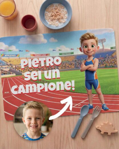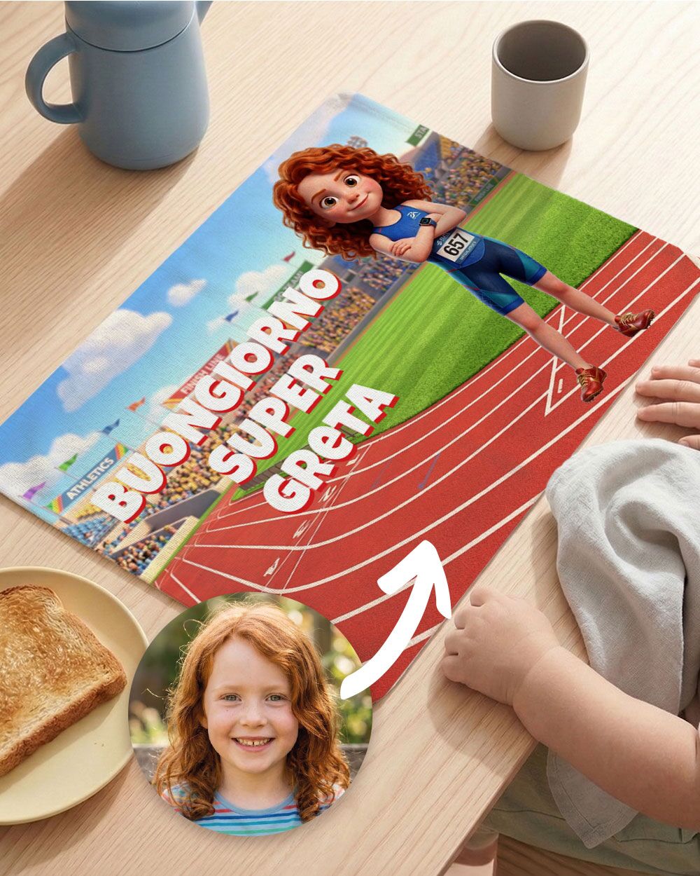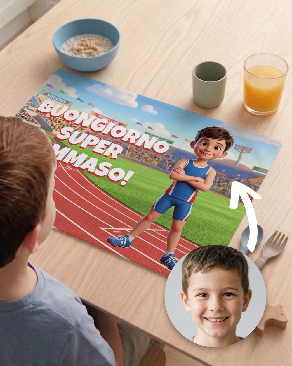 Tovaglietta Personalizzata Atleta con Foto Cartone Animato 3D del Tuo Bambino – Idea Regalo Scuola Compleanno Bambino
