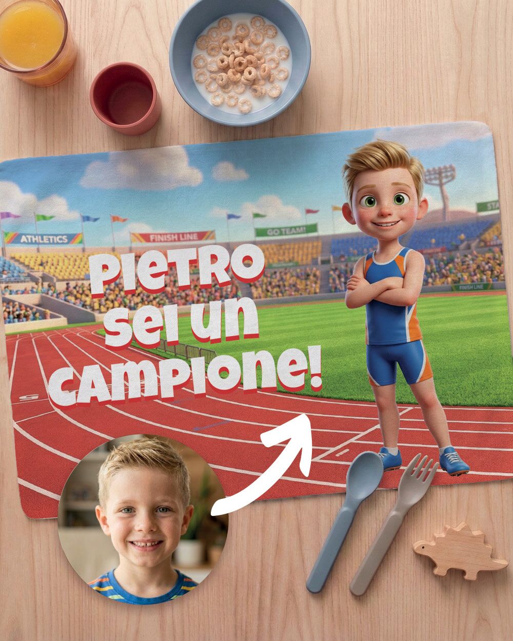 Immagina la faccia del tuo bambino quando si siede a tavola e scopre di essere diventato un campione sportivo con il suo volto, con divisa da atletica, braccia incrociate da vincente e lo stadio pieno sullo sfondo. Non è un disegno qualsiasi — è lui, trasformato in un piccolo atleta in stile cartone animato 3D grazie all’intelligenza artificiale, con il suo nome e un messaggio di incoraggiamento stampato in grande.