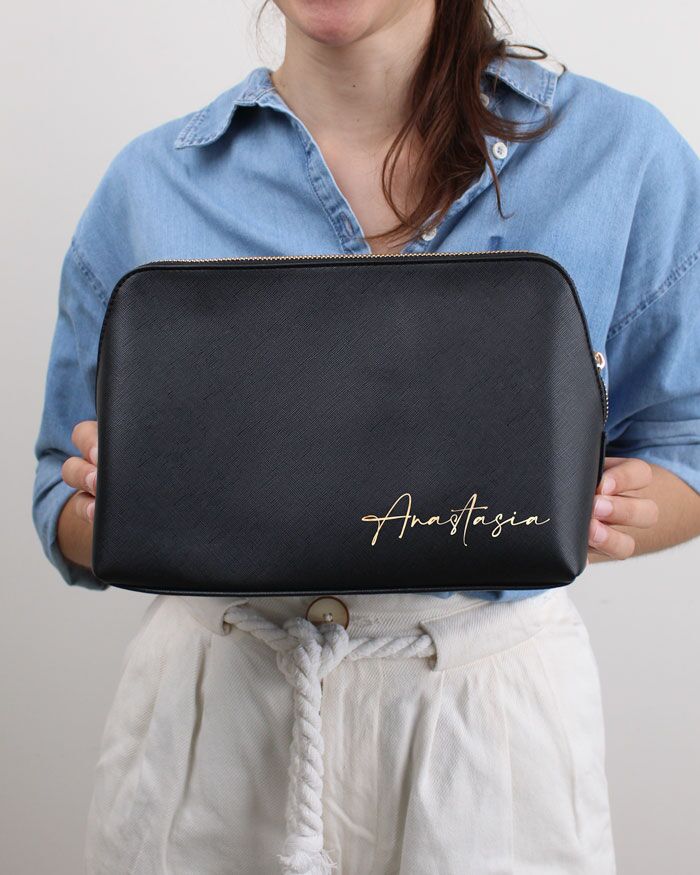 Elegante trousse da viaggio astuccio beauty case nécessaire porta trucchi in ecopelle effetto simil-graffiato personalizzato con il nome. Un’idea regalo fantastica per se stessi o per chi ama gli oggetti raffinati. Pratico per contenere tutti i tuoi cosmetici per il weekend, entrerà con facilità in valigia o nel borsone. La personalizzazione rende questa trousse assolutamente unica e bellissima per un regalo di stile a una donna amante del make-up e della cura di sé.