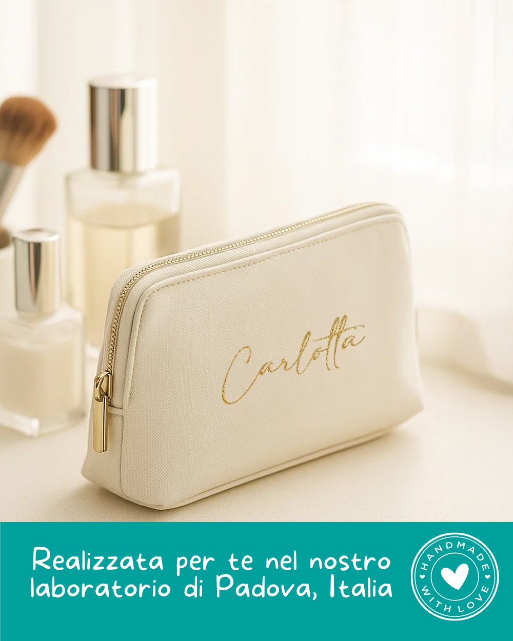 Ogni beauty case personalizzato viene realizzato con cura nel nostro laboratorio, così da garantire un risultato impeccabile e unico.