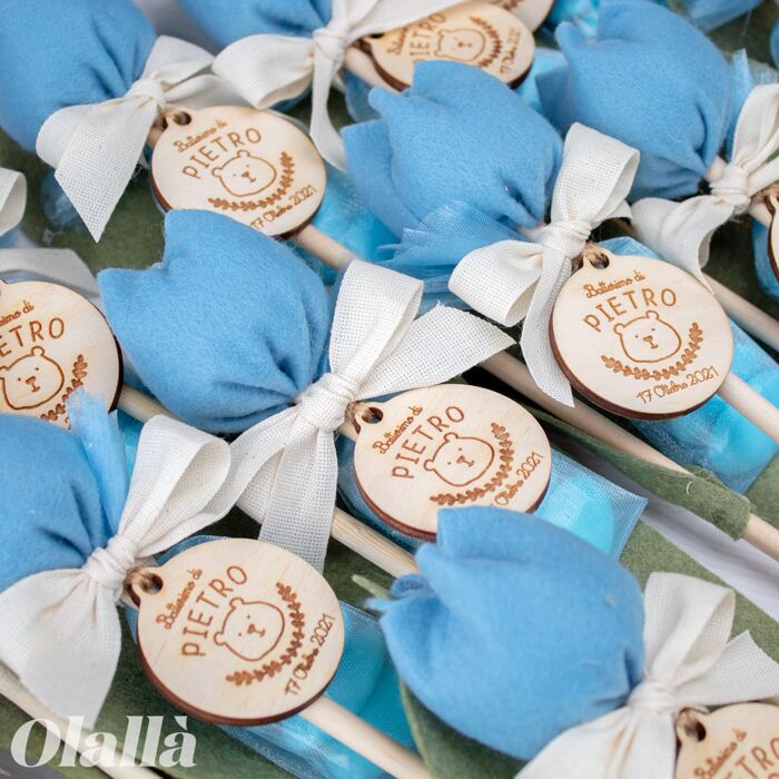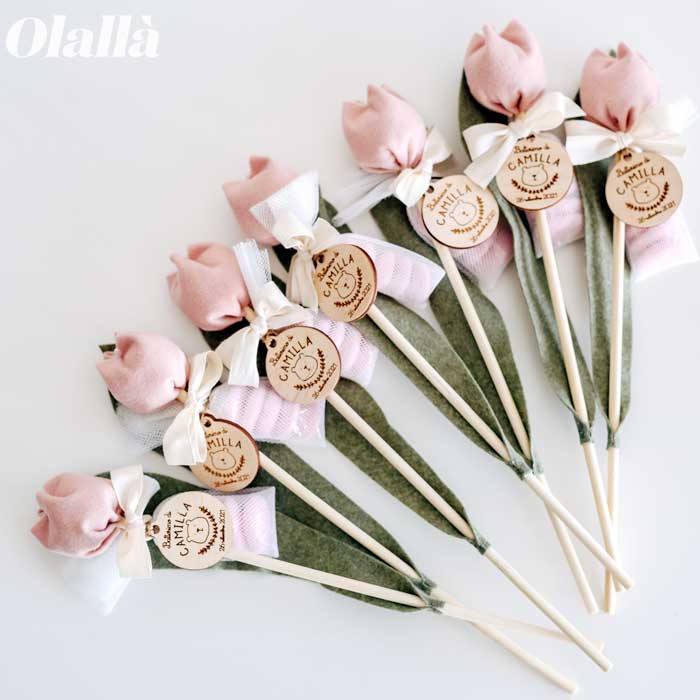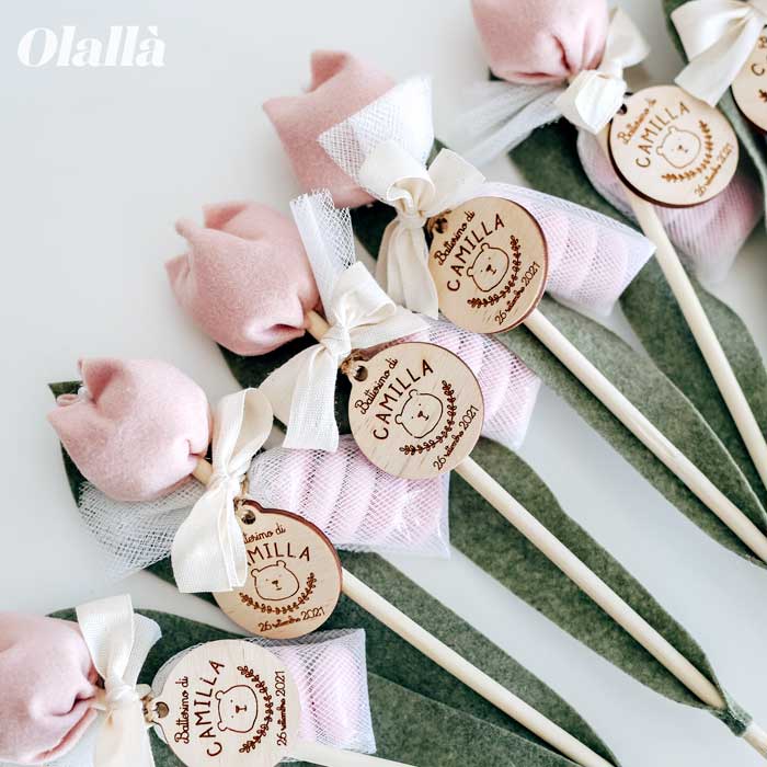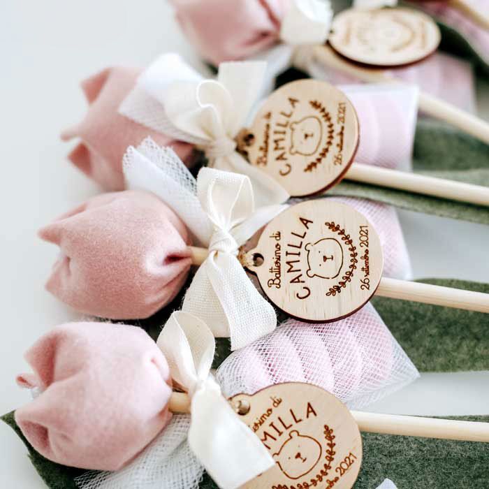 Delicati fiori di tulipano in tessuto fatti a mano in Italia ad uno ad uno da utilizzare come bomboniera per i tuoi eventi più belli. Tag in legno personalizzata con orsetto, nome e data. Dal battesimo alla comunione, dalla nascita al matrimonio, questi fiori potranno essere conservati per sempre dai tuoi invitati.