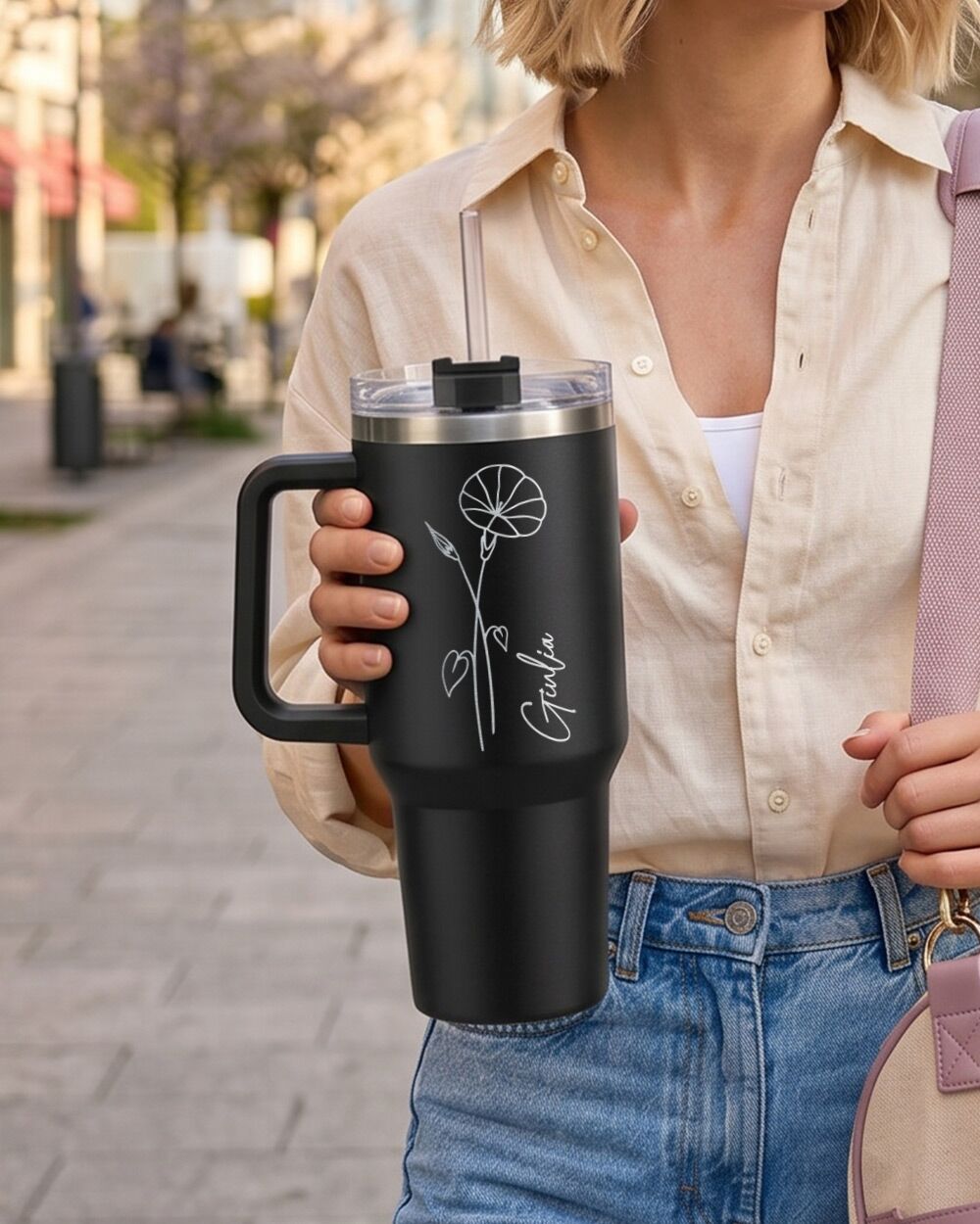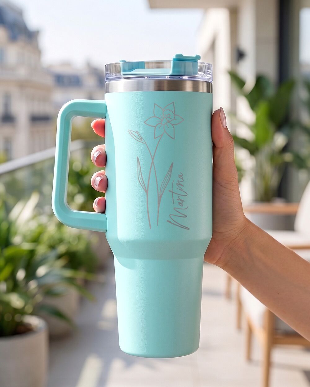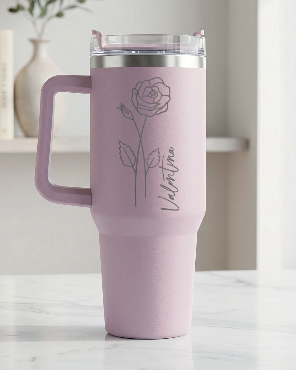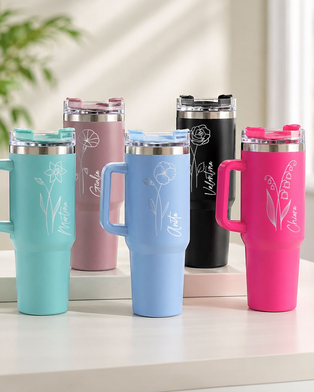 Su questo tumbler termico personalizzato da 1,2 litri, il fiore del mese non è una stampa qualsiasi: è inciso al laser direttamente sul corpo in acciaio inossidabile, insieme al nome della persona che lo riceverà. Un dettaglio che trasforma un oggetto di uso quotidiano in qualcosa di unico — un piccolo ritratto botanico che dice “questo è pensato esattamente per te”.
