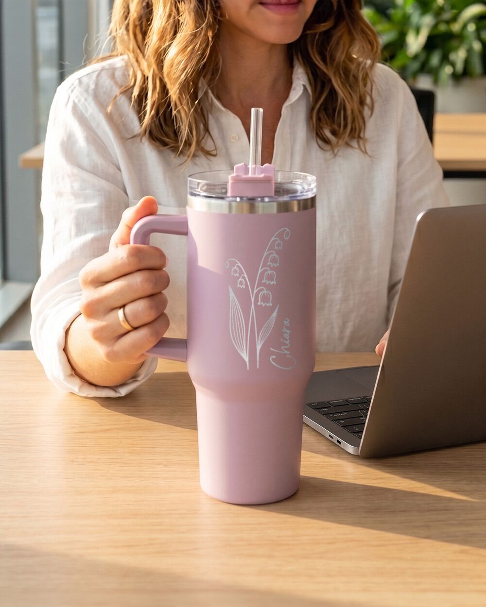 Il risultato è elegante, preciso e duraturo: l’incisione laser non sbiadisce nel tempo, non si cancella con i lavaggi e non risente dell’usura quotidiana. Ogni mattina, ogni pausa caffè, ogni sorso d’acqua fresca sotto il sole estivo — il nome e il fiore sono lì, nitidi come il primo giorno.