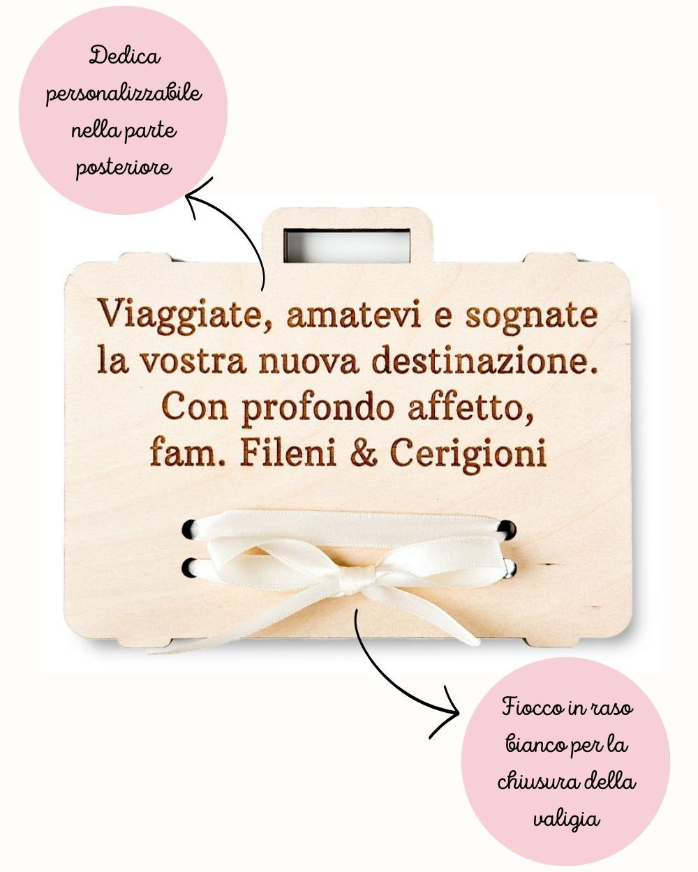 Puoi personalizzare i nomi degli sposi e la data del matrimonio sulla parte frontale, mentre sul retro puoi aggiungere una dedica speciale per augurare il meglio nel loro nuovo viaggio di vita insieme. Ma non è finita qui: aprendo la parte centrale della valigia, si possono inserire i soldi, come se fosse una busta, solo molto più originale e di classe!