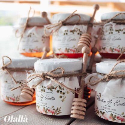 Dolcissimi vasetti di miele con etichetta floreale personalizzata con i nomi e la data del vostro evento, spago di canapa ed un meraviglioso copri vasetto in tessuto con delicati motivi ricamati bianchi. A scelta tra più formati, puoi scegliere di riceverle a casa da confezionare autonomamente o di riceverle già pronte e perfette per essere subito disposte sul tavolo del tuo evento. Ideale se stai organizzando un matrimonio rustico o country!