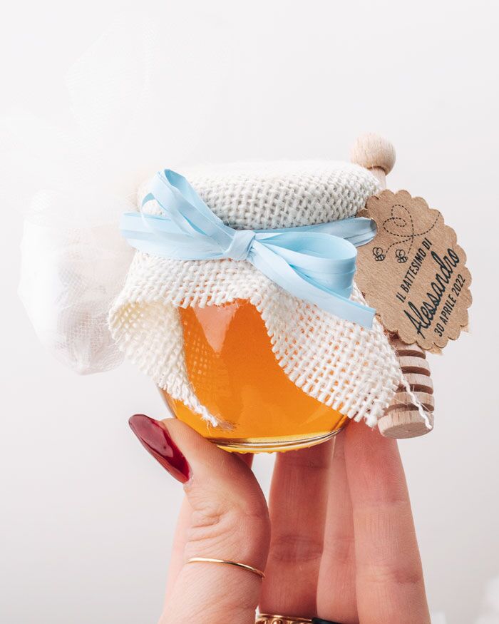 Dolcissimi vasetti di miele personalizzati con tag in carta kraft, spargimiele, coprivasetto in juta avorio e cordino in rafia. Personalizza il tag con l’intestazione, il nome del tuo bambino o bambina e la tua data speciale.