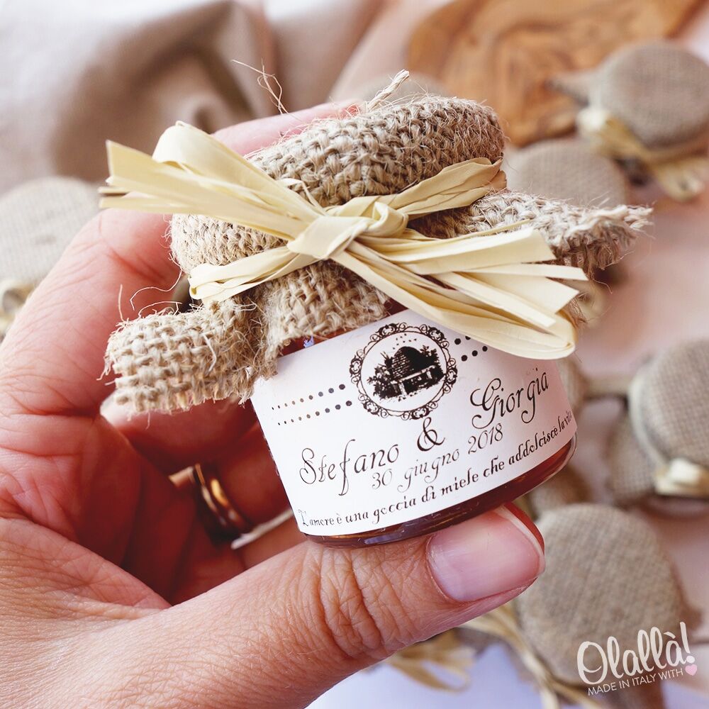Dolcissimi vasetti di miele personalizzati in stile shabby chic. Perfetti in occasione di un matrimonio, un anniversario importante, un battesimo o una comunione. Il copri vasetto in juta è adornato da un fiocco a tua scelta. L’elegante etichetta viene personalizza con i vostri nomi, la tua frase e data speciale.