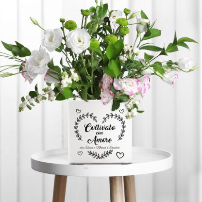 Questo splendido vaso in ceramica viene realizzato e stampato artigianalmente in Italia. Potete scegliere una delle nostre grafiche predefinite oppure scegliere una vostra frase particolare. La vostra frase verrà illustrata graficamente da una bravissima designer e quindi stampata ad alta qualità sul vostro vaso.