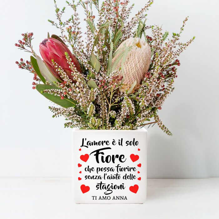 Questo splendido vaso in ceramica viene realizzato e stampato artigianalmente. Potete scegliere una delle nostre grafiche predefinite oppure scegliere una vostra frase particolare. La vostra frase verrà illustrata graficamente da una bravissima designer e quindi stampata ad alta qualità sul vostro vaso.