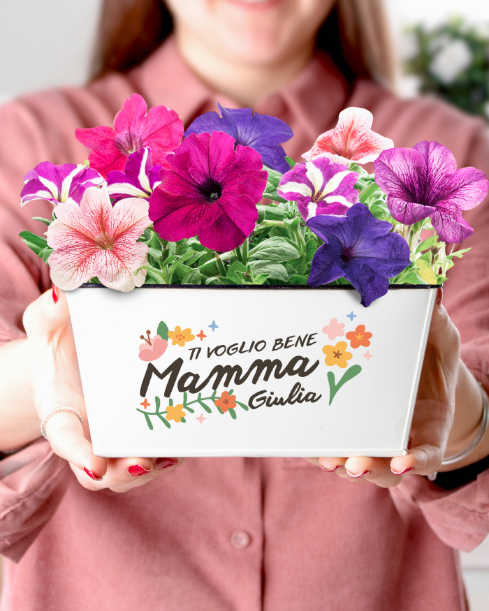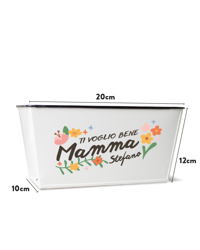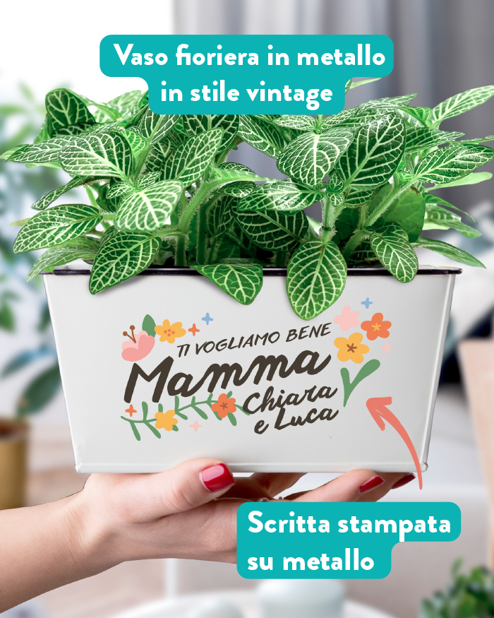 Ci sono regali che nascono già con un’identità precisa. Questo vaso fioriera in latta ce l’ha scritta nel design: un bouquet di decorazioni floreali colorate abbraccia tutta la superficie, mentre la scritta “Mamma” campeggia al centro, inconfondibile. Non sono elementi che puoi cambiare o scegliere — sono il cuore del progetto, quello che rende questo vaso subito riconoscibile come un regalo pensato per lei, per la tua Mamma. Quello che aggiungi tu — il messaggio in alto, il tuo nome e, se vuoi, una dedica sul retro — è la parte che lo rende unico nel suo genere, perché parla con le parole che solo voi due condividete.