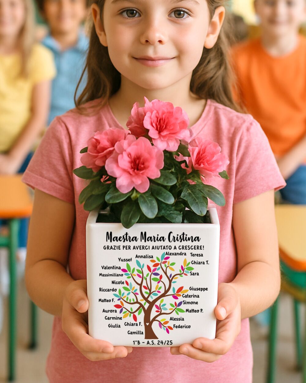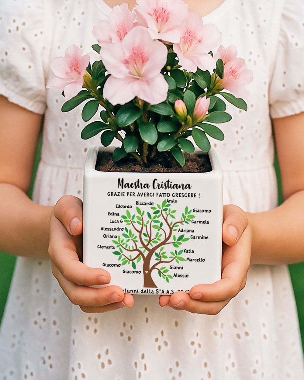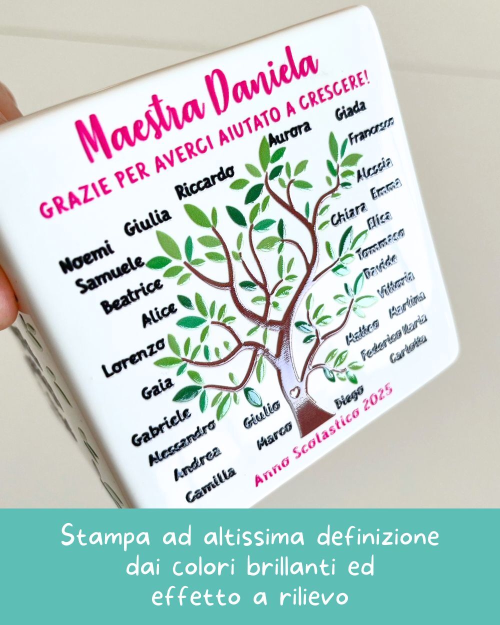 Arriva sempre quel momento — l’ultimo giorno di scuola, i bambini in fila con il cuore in gola — in cui le parole sembrano troppo piccole per dire grazie. Questo vaso in ceramica personalizzato con l’albero della vita racconta esattamente ciò che quell’anno ha significato: una maestra che ha messo radici nella vita di ogni bambino, e tanti piccoli rami — uno per ogni nome — che crescono grazie a lei.