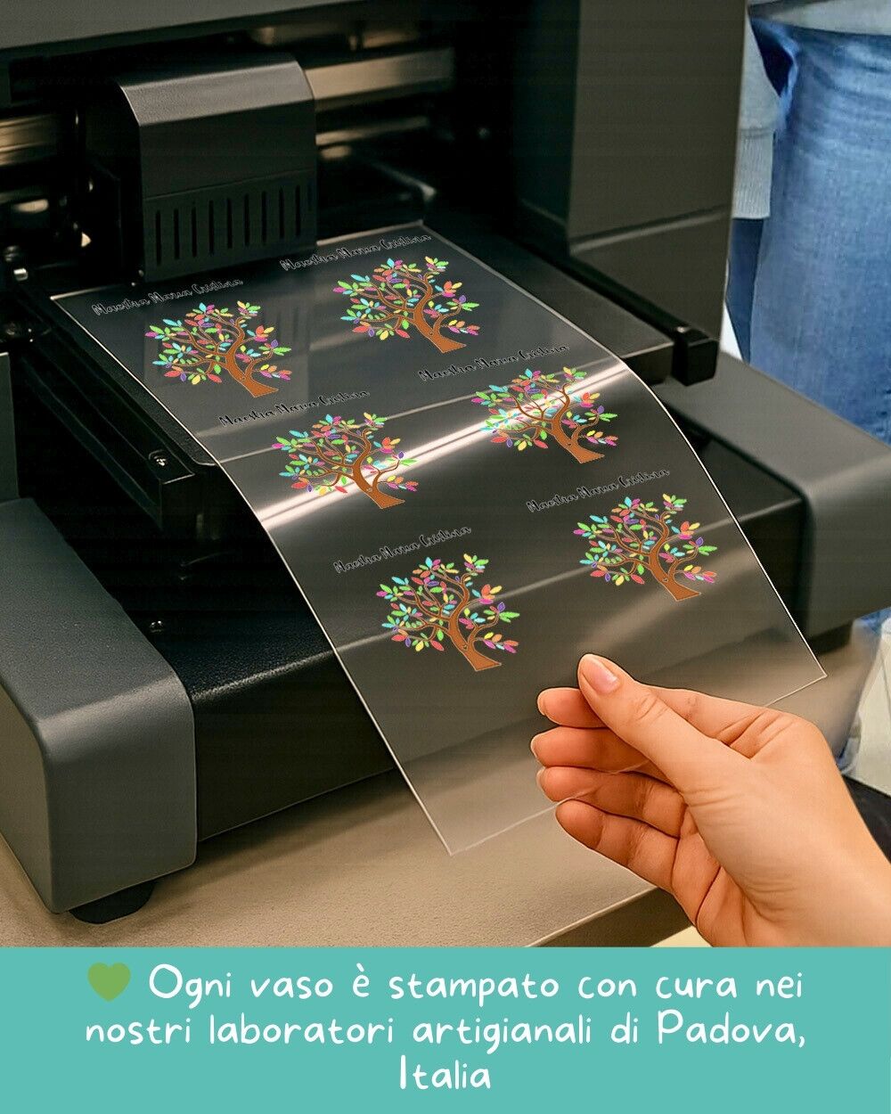 Personalizzato in Italia — Ogni vaso viene stampato nel nostro laboratorio a Padova con tecnologia UV di qualità e attenzione artigianale ai dettagli. Dalla tua schermata al vaso finito, tutto passa dalle nostre mani.