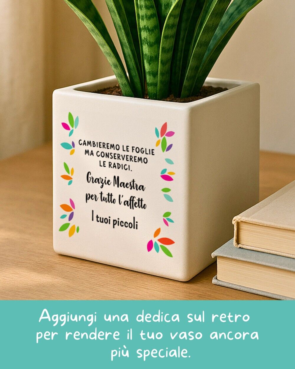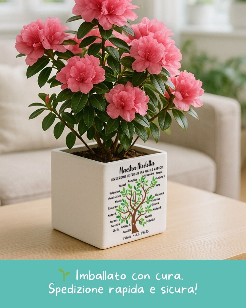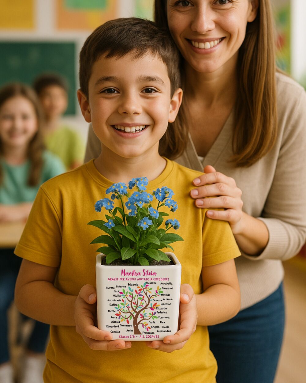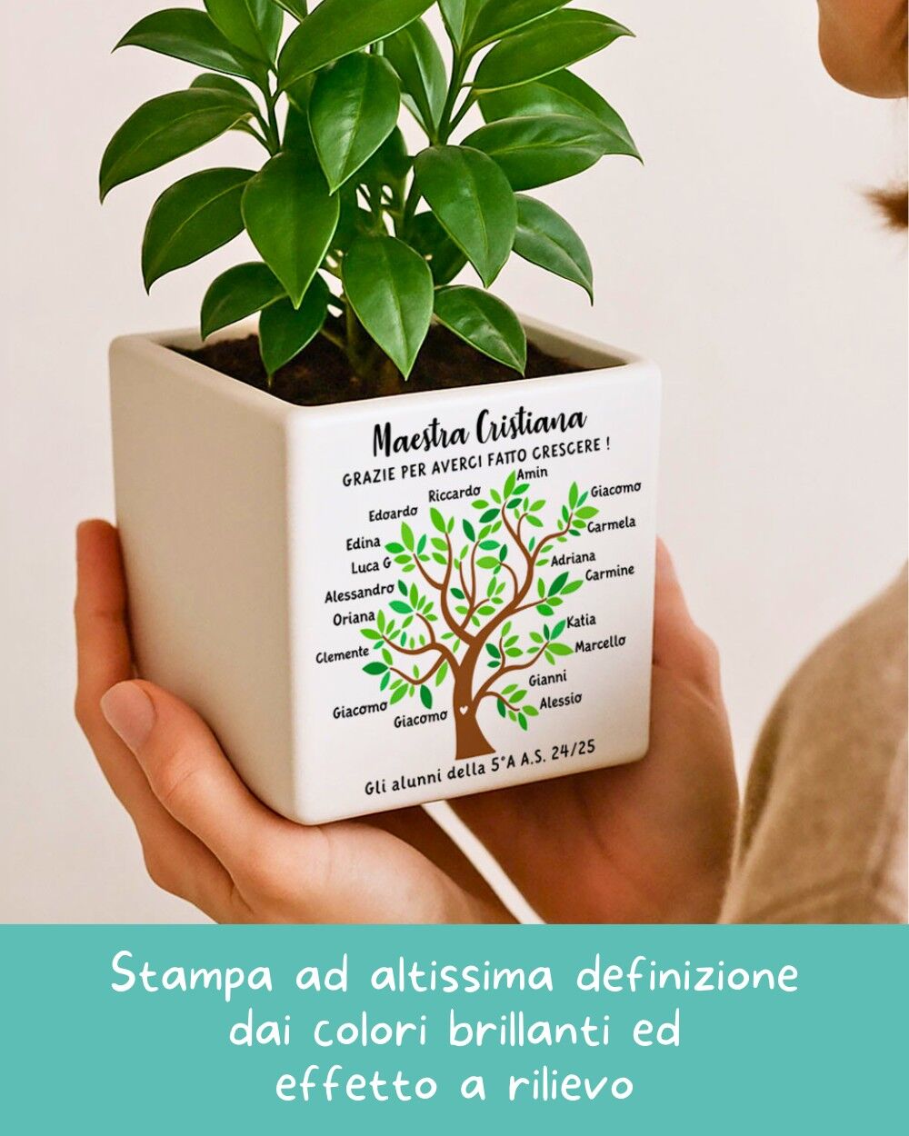 Creato con cura, non in serie — Ogni vaso viene personalizzato su richiesta da persone vere: controlliamo la grafica, prepariamo il file e produciamo il tuo ordine uno alla volta. Perché il regalo della maestra non è un semplice oggetto, è il modo in cui una classe intera dice grazie.