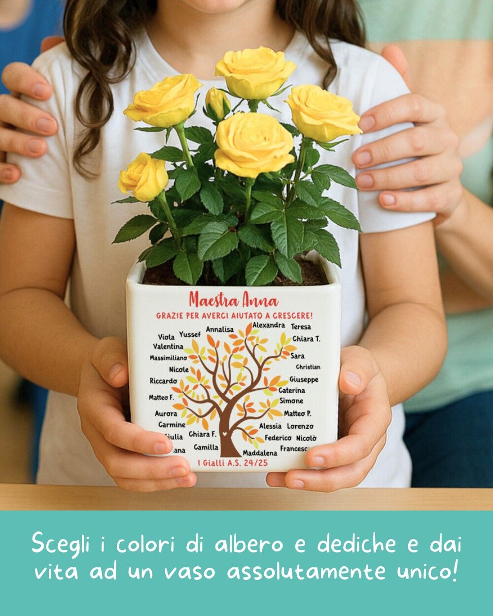 Assolutamente sì. Il configuratore ti permette di inserire i nomi degli alunni una volta sola e poi creare varianti: cambia solo la dedica (e magari i colori) per ogni insegnante. Molti genitori ordinano 3-4 vasi insieme per maestra, vice-maestra e insegnante di sostegno.