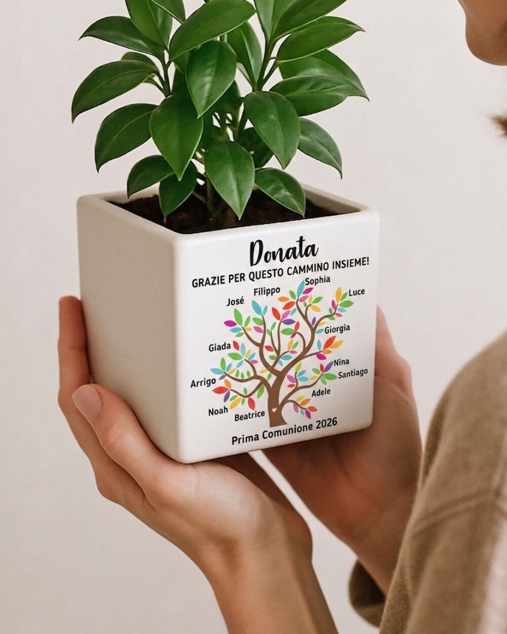 Il vaso con albero della vita nasce come regalo di fine anno per la catechista, ma funziona alla perfezione per qualsiasi figura che accompagna i bambini nel cammino di fede: il catechista uomo, la responsabile dell’oratorio, chi guida il gruppo di cresima o di prima comunione, la suora dell’istituto. Se stai cercando regali originali per catechisti da fare insieme a tutto il gruppo di catechismo, questo è il prodotto giusto: basta raccogliere i nomi dei bambini e il resto si fa in pochi minuti. È uno dei regali più significativi proprio perché tiene insieme il simbolo dell’albero della vita — così vicino al messaggio cristiano — e la personalizzazione reale con i nomi di quel gruppo, di quel percorso, di quell’anno unico.