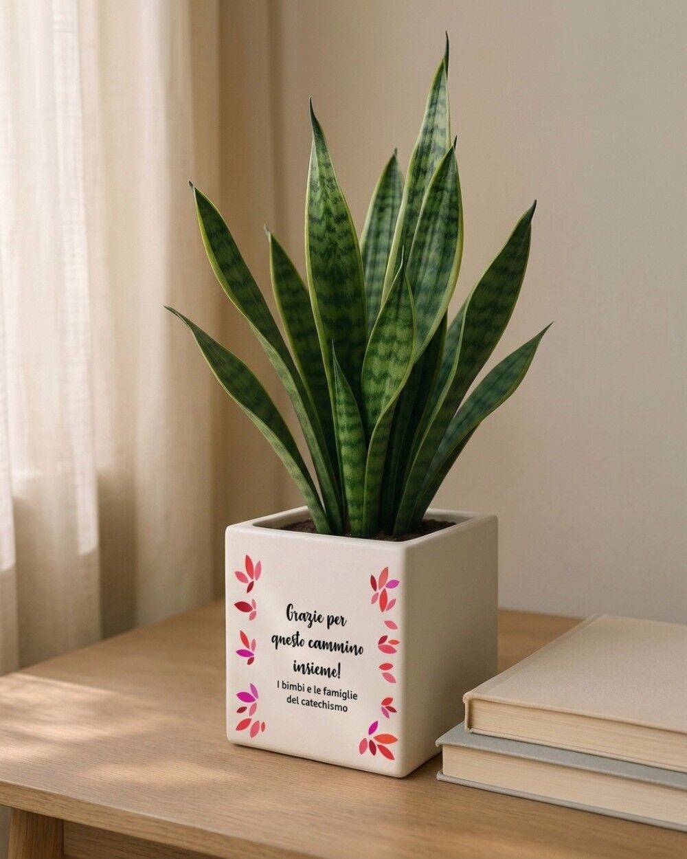 Il vaso piccolo (10 × 10 × 10 cm) è perfetto per un pensiero delicato o se lo abbini ad altri regali. Il vaso grande (13,5 × 13,5 × 13,5 cm) è la scelta migliore per un regalo di tutto il gruppo di catechismo: più spazio per i nomi e più impatto visivo quando viene aperto.