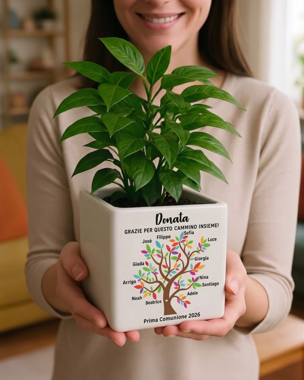 C’è un momento — alla fine del cammino di catechismo, dopo la comunione o la cresima — in cui le parole sembrano sempre troppo piccole per dire grazie. Questo vaso in ceramica personalizzato con l’albero della vita racconta quello che quei mesi hanno significato: una catechista che ha messo radici nella vita di ogni bambino, e tanti piccoli rami — uno per ogni nome — che crescono grazie a lei.