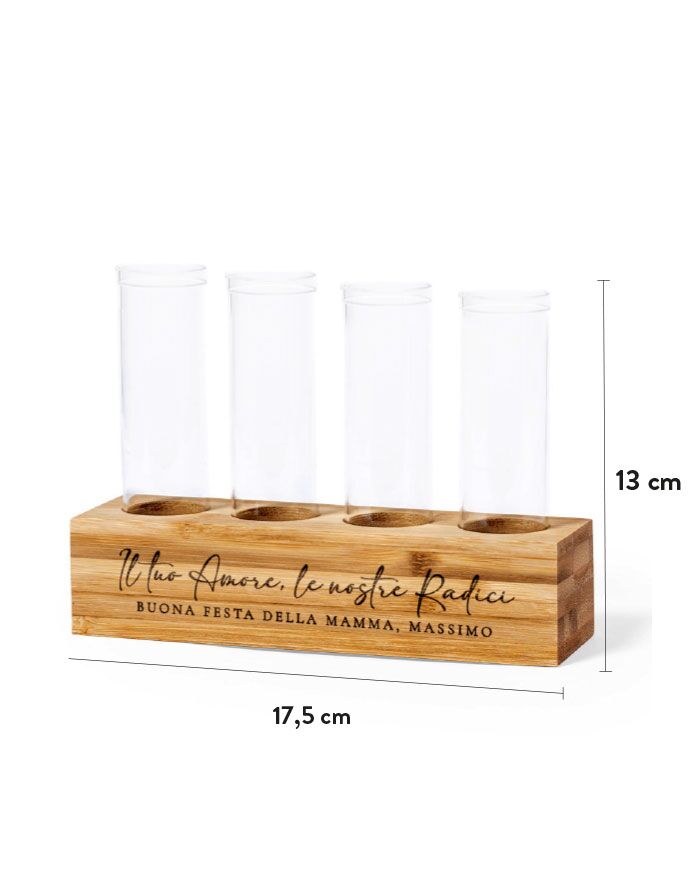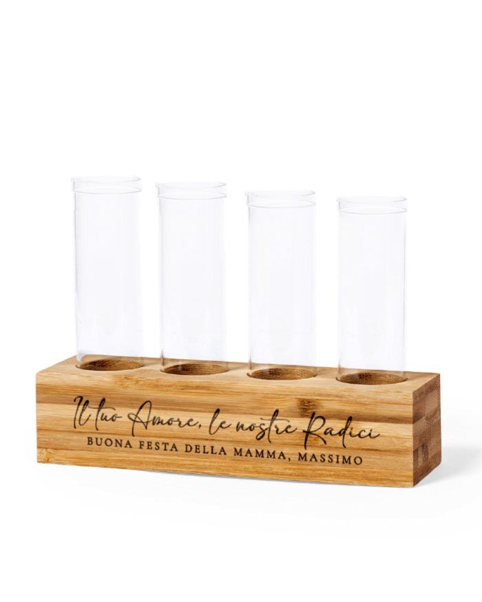 La struttura in bambù naturale regge quattro provette di vetro borosilicato — il tipo di vetro che non si crepa con le variazioni di temperatura e dura nel tempo. La base è liscia, compatta, pronta ad accogliere la dedica che scegli tu: una frase, un nome, un “grazie” che vale più di mille parole. L’incisione laser la rende nitida e permanente, non un’etichetta che si stacca.