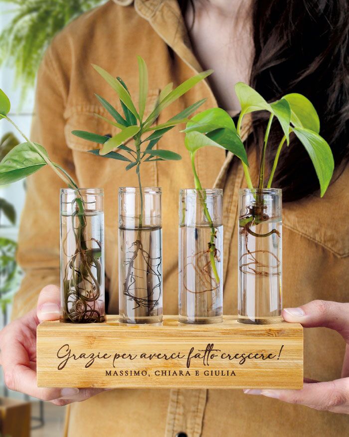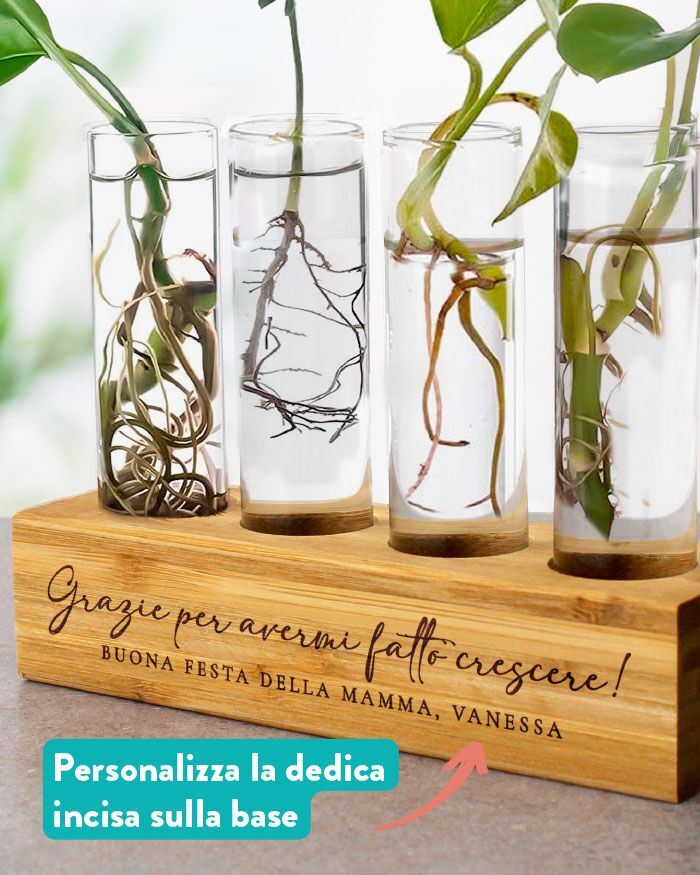 C’è chi regala fiori che durano una settimana. E c’è chi regala un regalo con le piante che la mamma curerà per anni, con il tuo nome inciso sul bambù a ricordargelo ogni giorno. Questo vaso porta talee è esattamente questo: un oggetto vivo, decorativo e personalissimo, che cresce insieme alle talee che ci mette dentro.