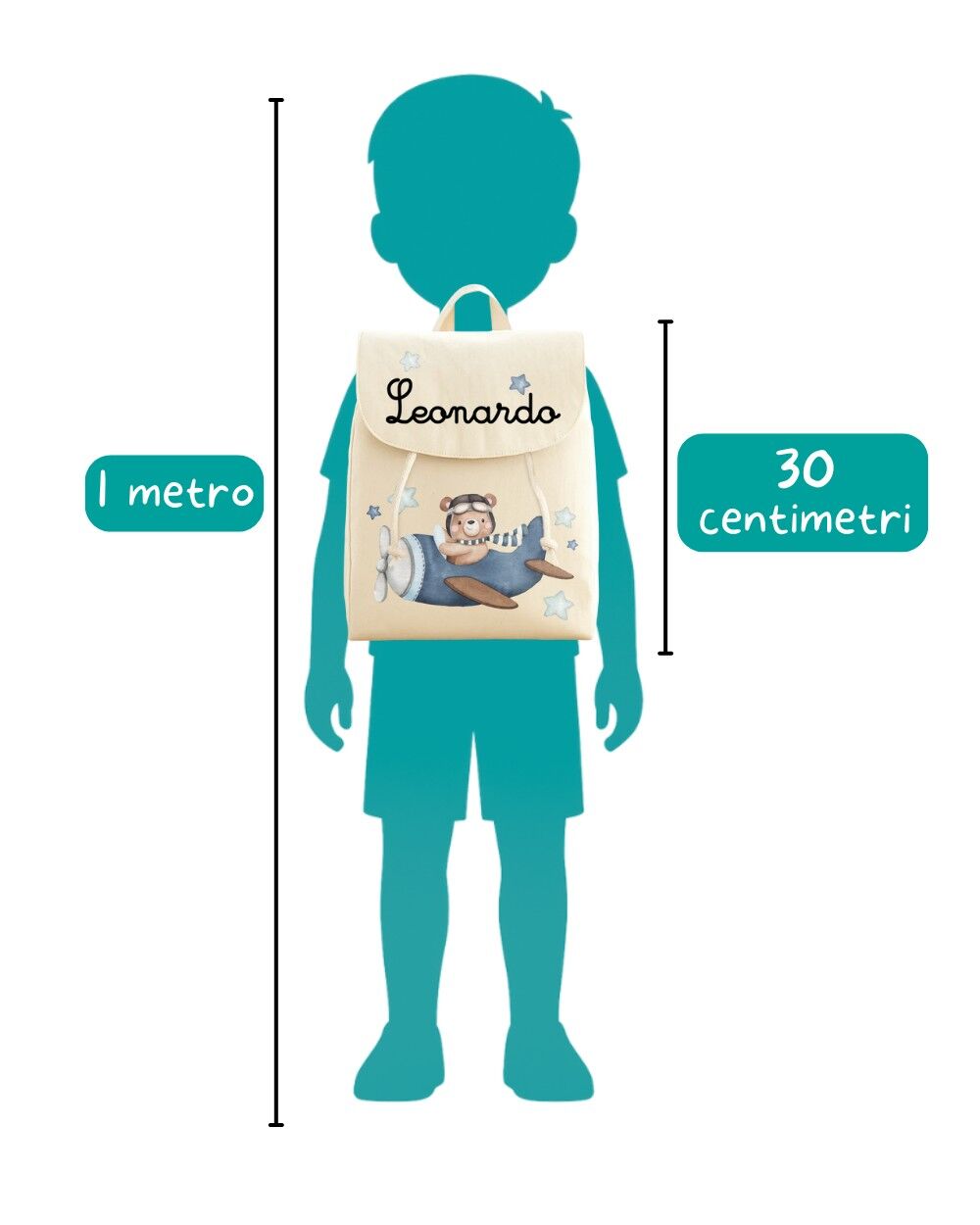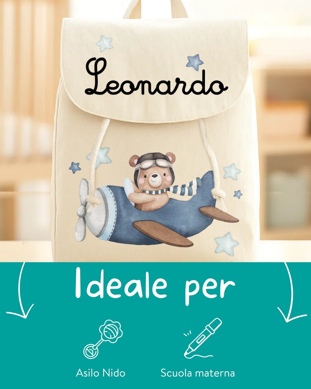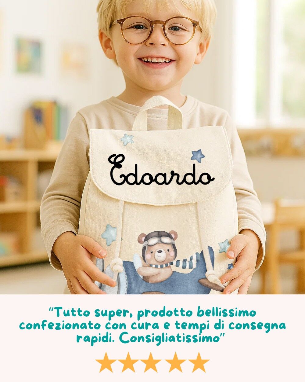 Ogni zainetto è personalizzato con il nome del bambino, che viene stampato sulla parte frontale insieme alla dolcissima illustrazione dell’orsetto viaggiatore: un piccolo compagno d’avventure pronto a partire ogni mattina per nuove scoperte!