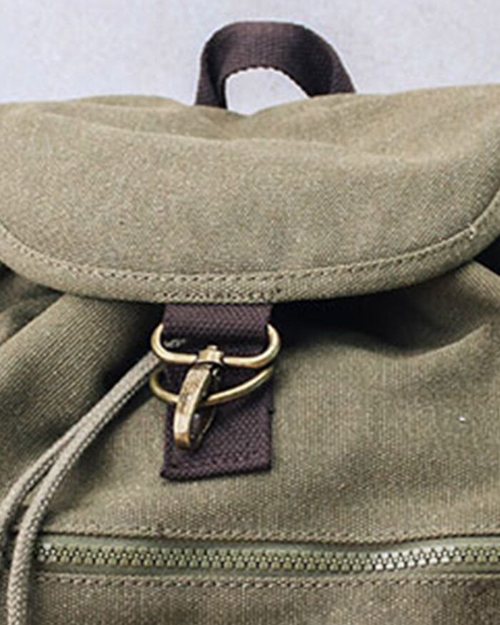 Materiali: Canvas lavato, zip e ganci in bronzo. Sono presenti tasca frontale con zip, tasca interna con zip, tasche laterali, base imbottita, chiusura con cordino, spalline imbottite e regolabili.