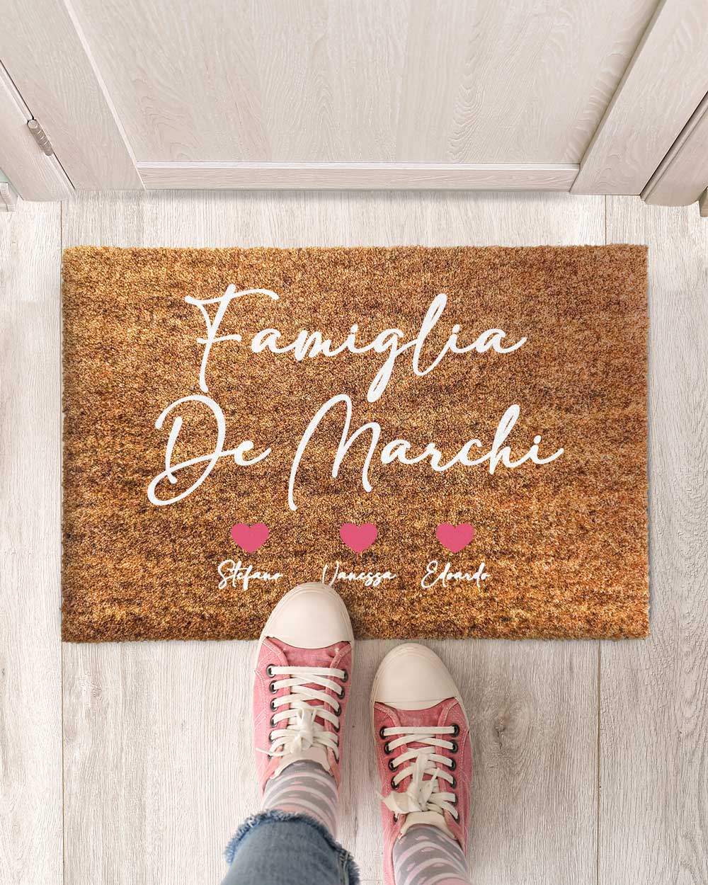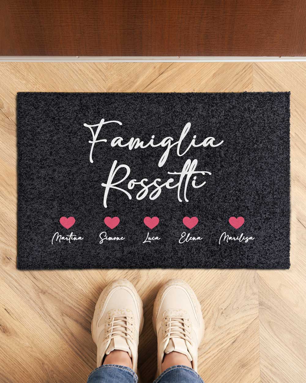 - Personalizzazione: è possibile personalizzare lo zerbino con l’intestazione e i nomi dei componenti della famiglia. Il colore rosa dei cuoricini rimane standard.