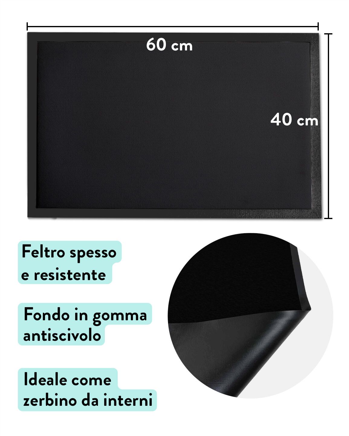 Questo zerbino personalizzato ha un fondo in gomma antiscivolo di colore nero ed è realizzato in tessuto tipo feltro spesso e resistente. E’ indicato per essere utilizzato come tappeto da interno, per poggiare scarpe e ciabatte all’entrata di casa, oppure come secondo zerbino di entrata per appartamenti in condominio. Non è consigliato per fungere da vero e proprio “zerbino” da esterno per la pulizia di scarpe molto sporche o bagnate in quanto, come tutti gli zerbini, la superficie personalizzata andrebbe con il tempo e l’utilizzo a deteriorarsi.