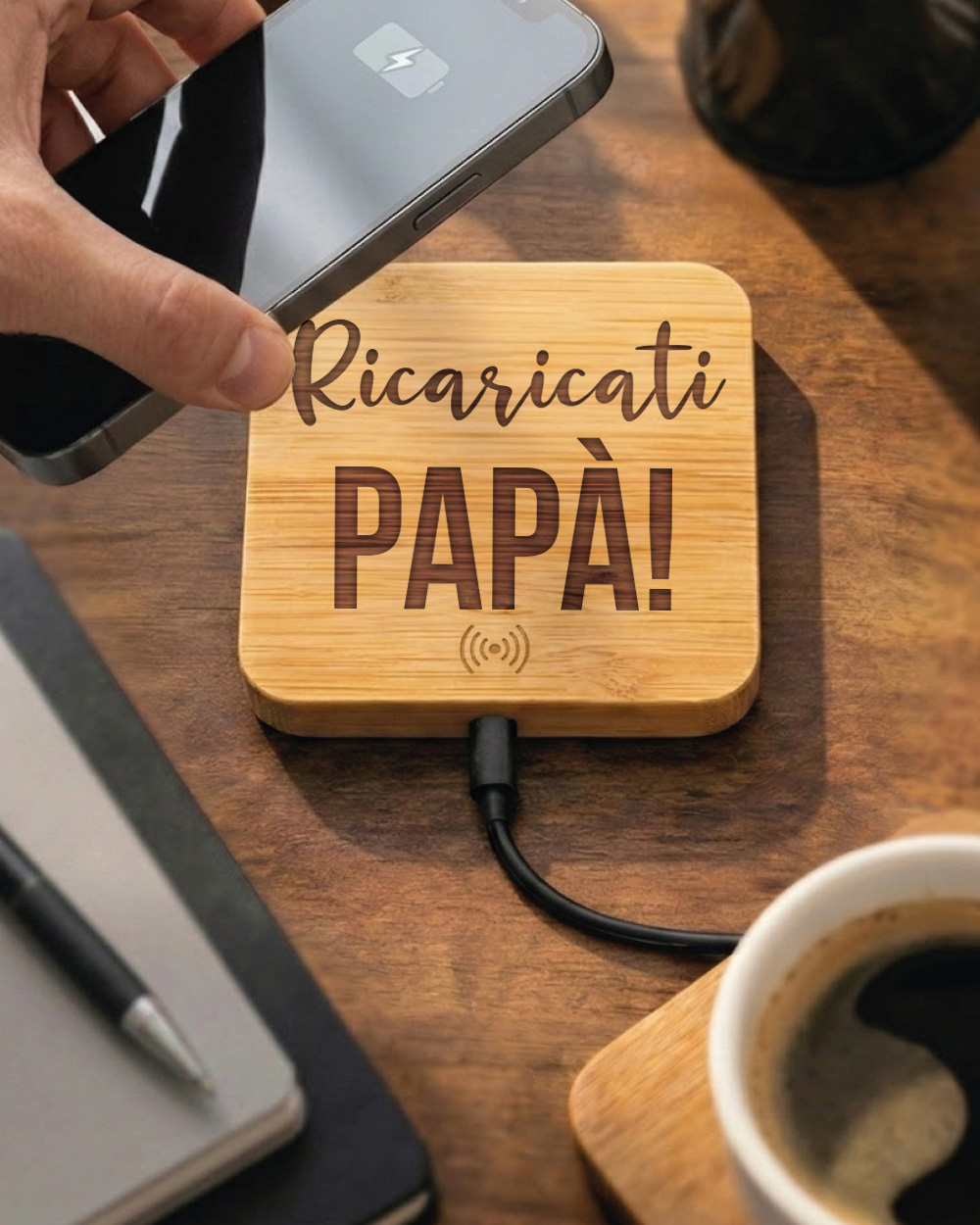 Caricatore Caricabatterie Wireless per Smartphone da Appoggio, Personalizzata “Ricaricati Papà” – Idea Regalo per la Festa del Papà, Compleanno